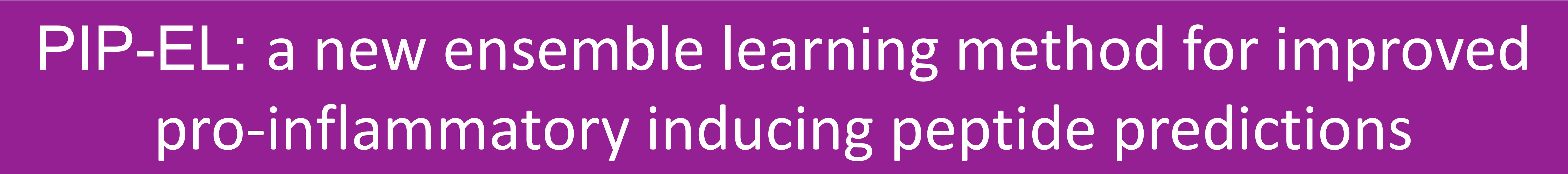 PIP-EL is web based prediction server for pro-inflammatory inducing peptides. Technically, PIP-EL was the fusion of 50 independent RF models, where each of the five different compositions including amino acid, dipeptide, composition-transition-distribution, physicochemical properties and amino acid index contained 10 RF models. For a given peptide, PIP-EL predicts its calss and probability values.